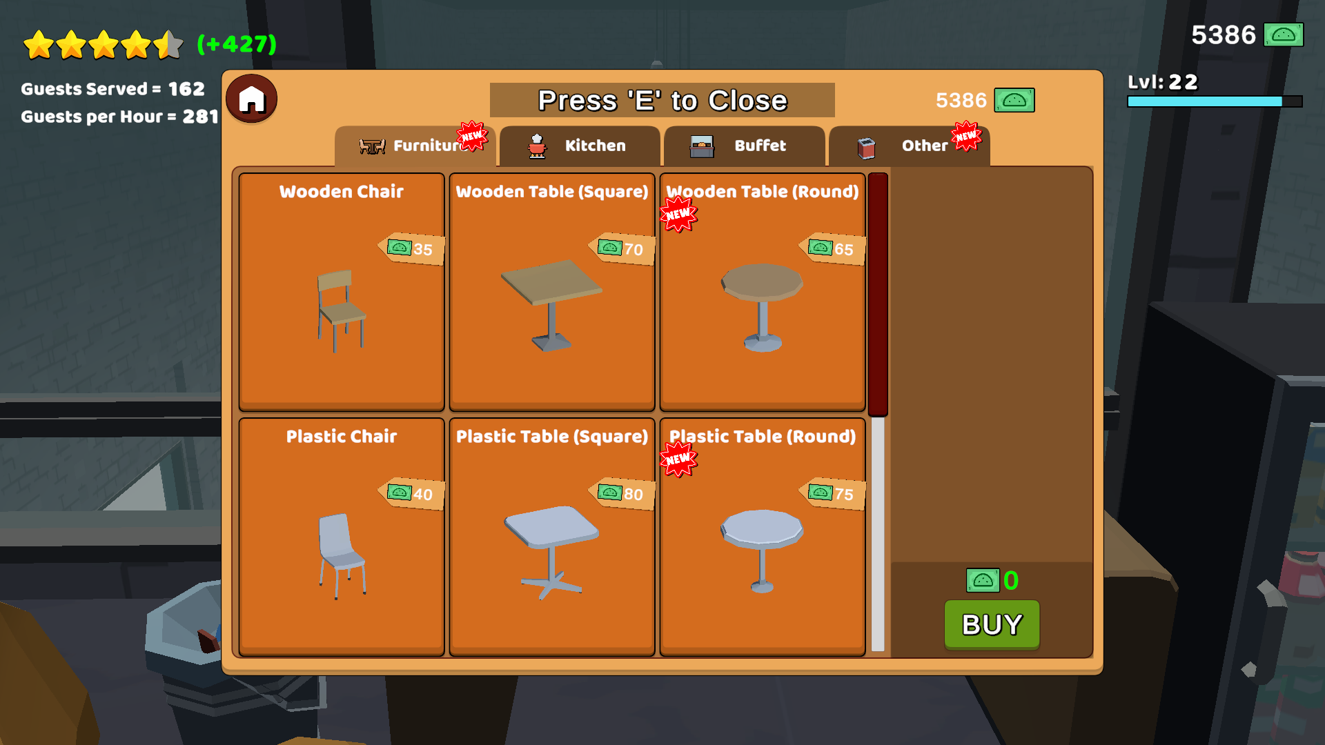In Buffet Simulator, offer a wide variety of foods and ensure that guests are taken care of in order to reach a 5 star rating.